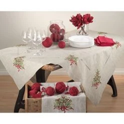 Saro Lifestyle Embroidered Holly Design Holiday Linen Blend Table Runners