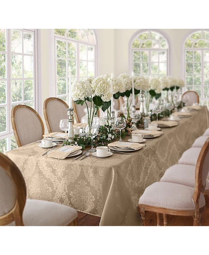 The Barcelona Damask table linens collection features a regal damask design in eight different rich, solid colors. 100% Polyester. Machine wash and dry. Made in China.