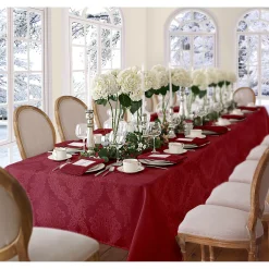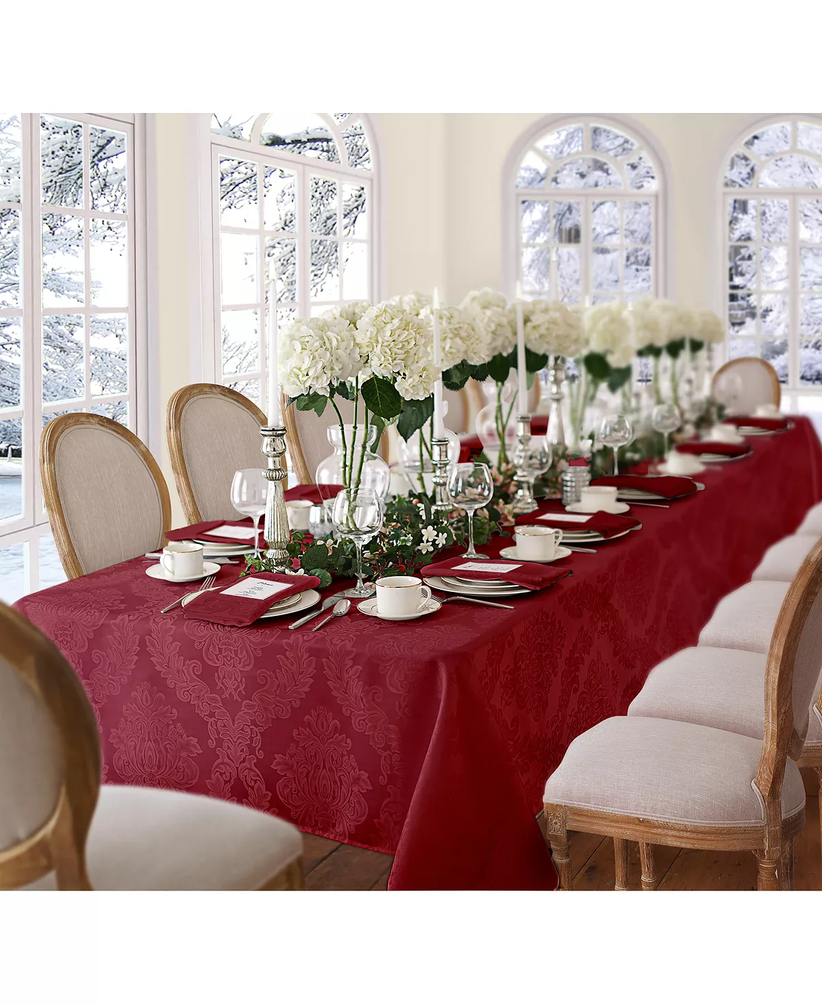 The Barcelona Damask table linens collection features a regal damask design in eight different rich, solid colors. 100% Polyester. Machine wash and dry. Made in China.