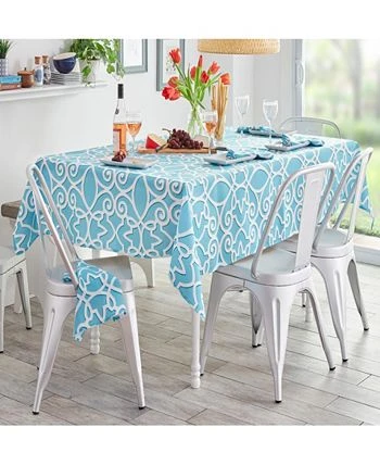 The Chase Geometric trellis indoor outdoor tablecloth is the perfect solution to your decorating and table cover needs. Trellis design features white geometric pattern on a bright a lively ground, making it versatile, yet fashionable. Excellent for special occasions, events, parties, summer gatherings and everyday use this table cloth has the soft hand of an ordinary tablecloth, with the added function you need. Fabric is water and stain repellant, mold and mildew resistant, and fade resistant. Unlike some outdoor tablecloths, the fabric can be ironed to release stubborn creases and make your tablecloth wrinkle free. Hemmed edge adds a finished look and prevents wear and tear. Available in a large selection of table shapes and sizes, including a version with an umbrella hole and zipper to fit all your entertaining needs. 100% Polyester. Easy care, machine washable.