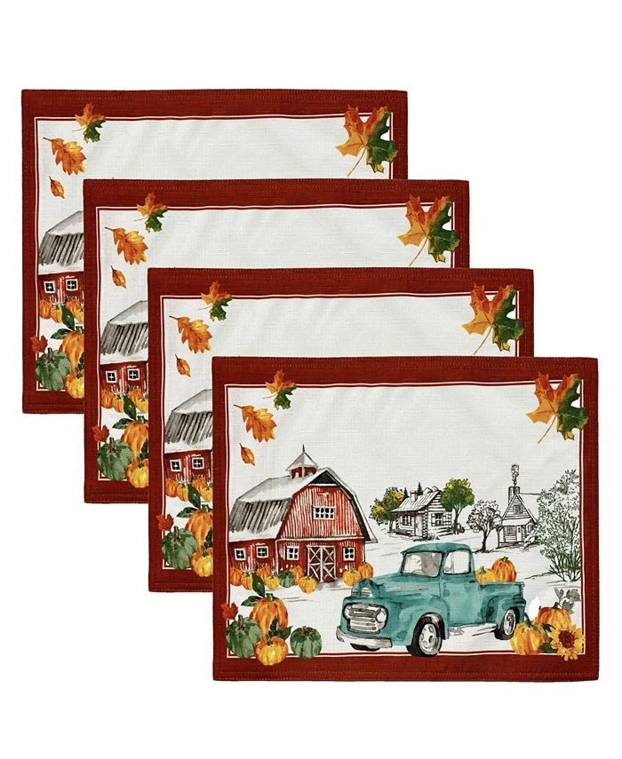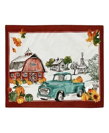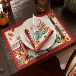 The Farm Fresh Pumpkin Truck printed placemat brings a festive note to table setting throughout the Fall season. Harvest inspired, decorated with orange, green pumpkins, sunflowers, leaves, a blue vintage-like farm truck, rustic red barn on a soft white ground with rust red double border design.