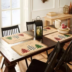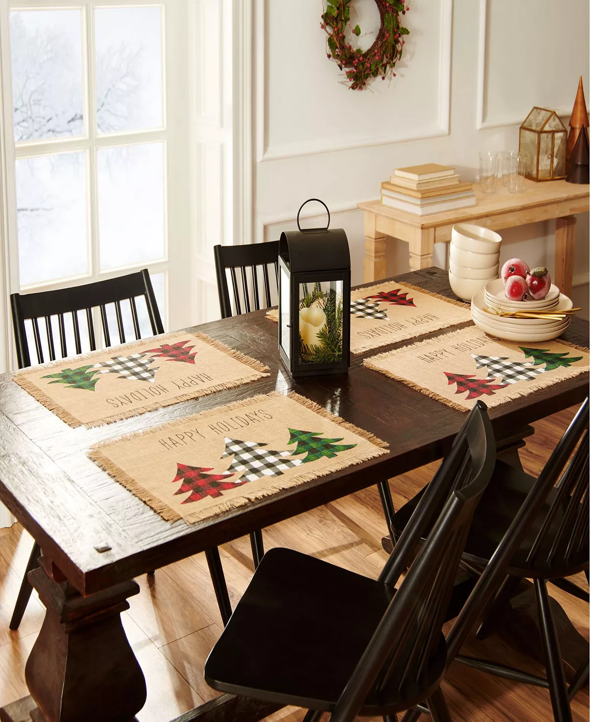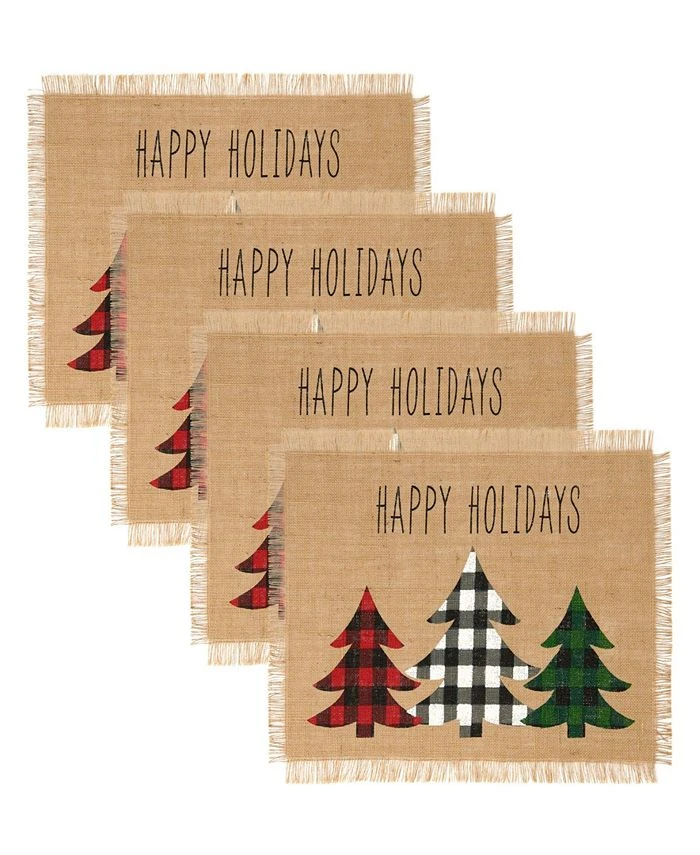 These holiday inspired natural woven burlap placemats are made from premium quality fabrications and feature a rustic and adorable holiday print with Christmas trees in red and black, white and black, green and black plaid checkered design and traditional “happy holidays” phrase.
