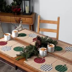 Stylish, rustic and beautiful the Farmhouse Living Collection offers everything you need to create the shabby chic, modern country home. These holiday inspired placemats feature buffalo check Christmas ornaments with twine tie accents. Fringe edges add style and charm.