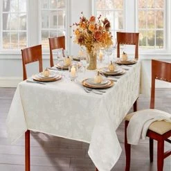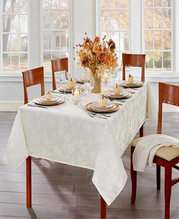 The Elegant Woven Leaves Damask tablecloth is the perfect solution to your decorating and table linen needs. Delicately woven jacquard leaf design gives it the versatility of a solid, with a touch of seasonal fashion. Excellent for special occasions, events, parties, fall gatherings and everyday use this table cloth has the soft hand of an ordinary tablecloth, with the added function you need. Fabric features water and stain repellant finish. Silky fabric can be ironed to release stubborn creases and make your tablecloth wrinkle free. Hemmed edge adds a finished look and prevents wear and tear. Available in a large selection of table shapes and sizes to fit all your entertaining needs. 100% Polyester. Easy care, machine washable.