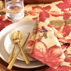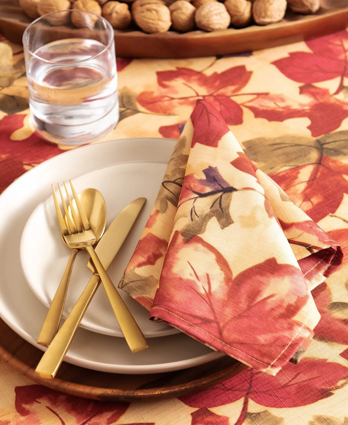 Printed watercolor leaves tossed on our easy car polyester tablecloth make this the perfect style for both Thanksgiving and all Autumn long. Coordinating napkins are available. Tablecloths Sold individually.