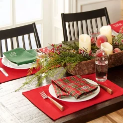 - Holiday inspired, each set features four solid red ribbed textured placemats and a set of four napkins featuring red, green solid colors and red, green plaid designs