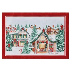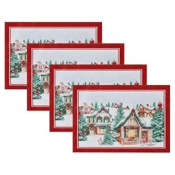 - Inspired by beloved Christmas stories, this placemat set is decorated with a quaint, snow-covered holiday village, green pine trees, and festive garland with red bows and ornaments