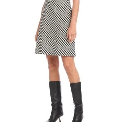 Chic in check, this bias cut stretchy skirt offers a figure-flattering silhouette. This skirt pairs perfectly with chunky cozy sweaters.