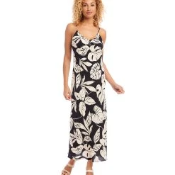 Designed to set a romantic tone, this midi dress is detailed with a unique tropical palm print and a figure-flattering cut on the bias for stunning draping.