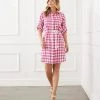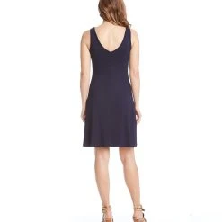 A set of double v’s suspend from the slender straps of a jersey-knit tank dress that gently flares into a flattering a-line silhouette.