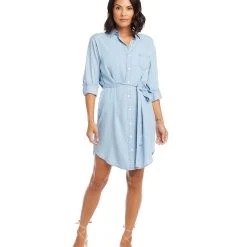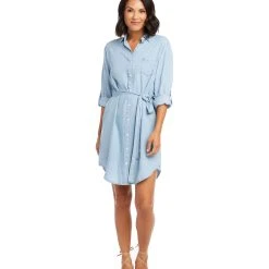 This new dress will quickly become a beloved go-to style thanks to its flattering silhouette. A tie waist and easy roll tab sleeves complete this effortless chambray piece.