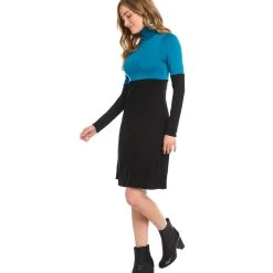 A great piece for transitioning into cooler temperatures, on trend color blocked long sleeves and turtleneck ensure warmth and comfort. Fashioned in soft and cozy jersey, this dress is timeless and makes for a sophisticated office to evening look.