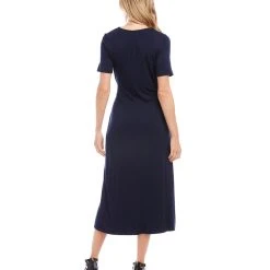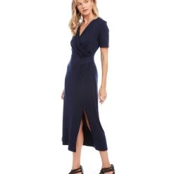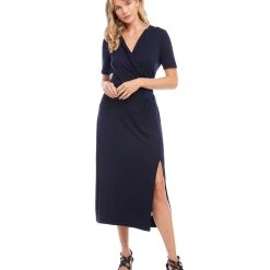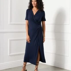 Elegant and alluring, this evening-ready midi dress is cut from fluid jersey-knit fabric and detailed with graceful draping. It’s finished with a stylish side-slit.