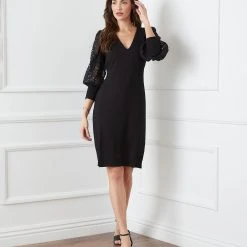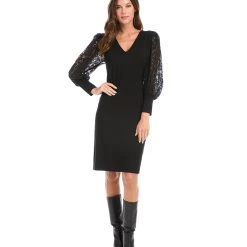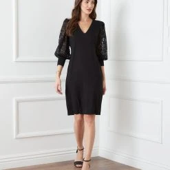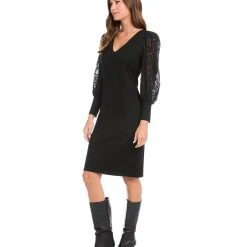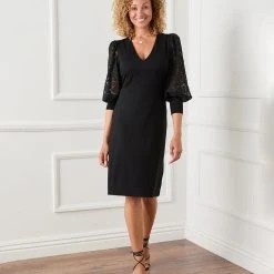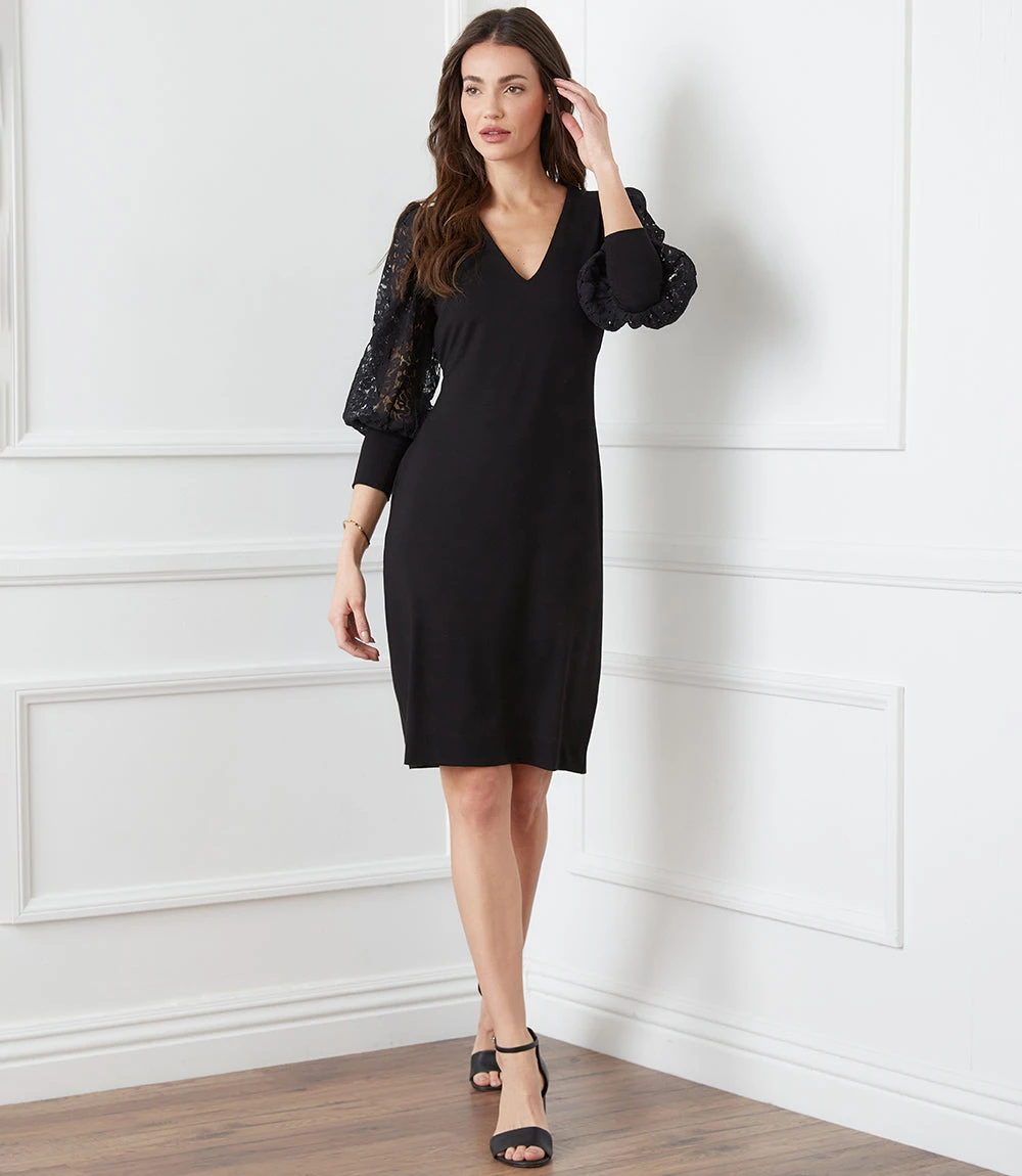 Romantic allure is found in these airy lace sleeves. This curve-defining dress is cut from soft jersey-knit for a comfortable, evening look.