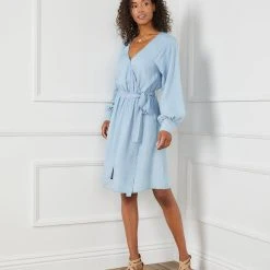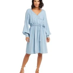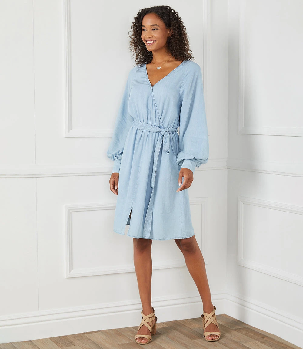 Effortless style and comfort meet in this airy, relaxed faux-wrap dress that’s finished with a waist tie for added shape. Wear this versatile denim dress with sneakers for a casual look or dress it up with heels.