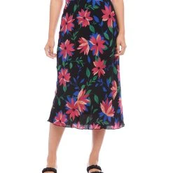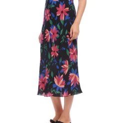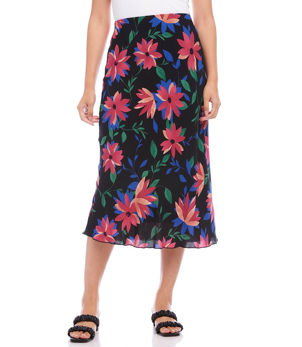 A vibrant floral print enhances the romantic charm of this swingy bias cut skirt in a stylish midi length. It features an easy pull-on silhouette that flows away from the body in streamlined sophistication.