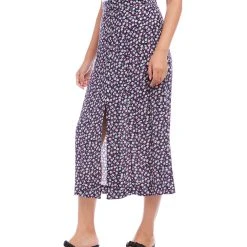 A charming floral print distinguishes this woven midi skirt finished with a button front. It also features an elasticized waistband for ease and comfort.