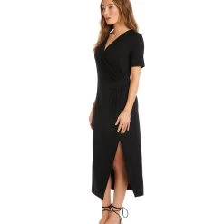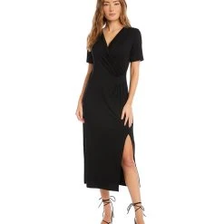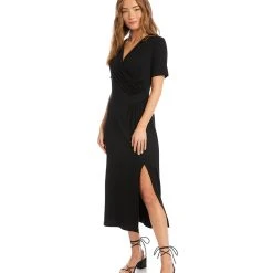 Elegant and alluring, this evening-ready midi dress is cut from fluid jersey-knit fabric and detailed with graceful draping. It’s finished with a stylish side-slit.