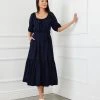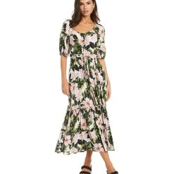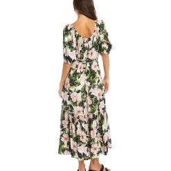 Perfect for wedding season, this eye-catching floral dress is a feminine favorite. Its bohemian styling provides an on-trend look, while the tiered midi silhouette offers soft movement. It also features a flattering cinched waist and matching belt.