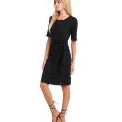Elegant and alluring, this curve-defining jersey-knit dress follows your curves with it’s sultry form-fitting silhouette. Its stylish tie-front adds beautiful dimension.