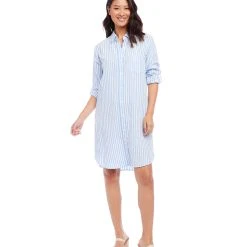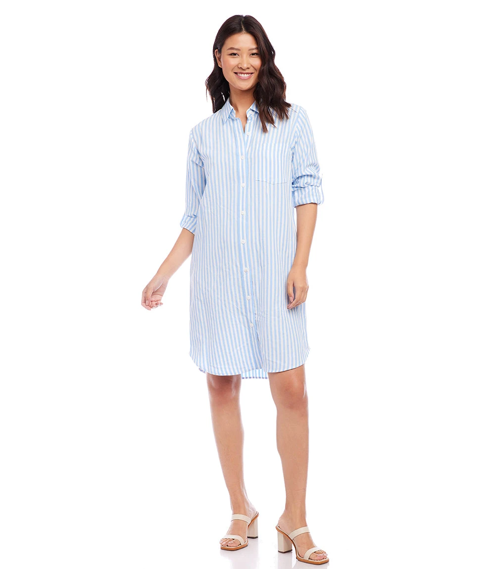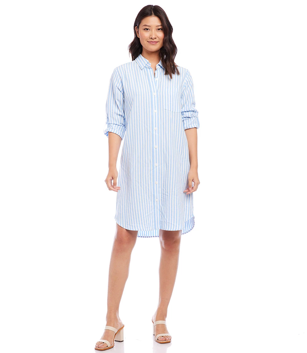 A relaxed striped dress cut from a cool and breathable linen blend. This versatile button-front dress features cuffed roll-tab sleeves and a shirt pocket. Wear it open as a jacket, or buttoned as a dress.