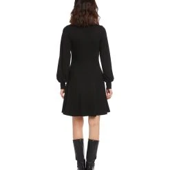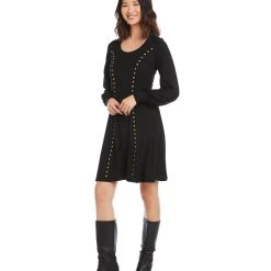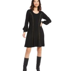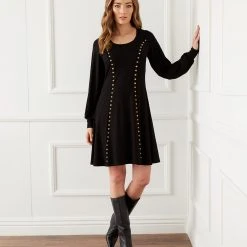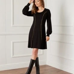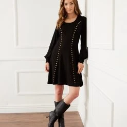 Statement-making puff sleeves frame this figure-flattering a-line dress cut from buttery soft jersey-knit. Brass studs lend a tough-luxe look to this classic little black dress.
