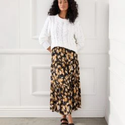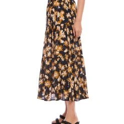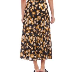 Breezy crepe fabric shapes this free-flowing midi skirt silhouette patterned with a vibrant floral print. Its tiered hem enhances the Bohemian charm. It features an elasticized waistband for all day comfort.