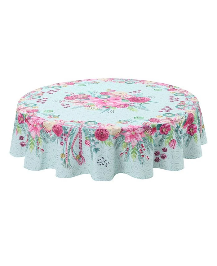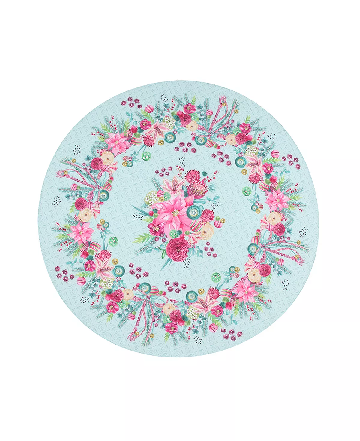 Out with the old, in with the new. This holiday design “Boho Christmas” round tablecloth, features a watercolor floral arrangement in magenta, pink, red, and green. The centerpiece of clustered poinsettias, ornaments, and greenery is the perfect addition to the tone-on-tone mint trellis background.