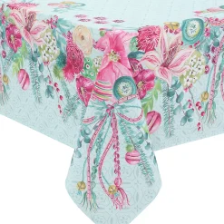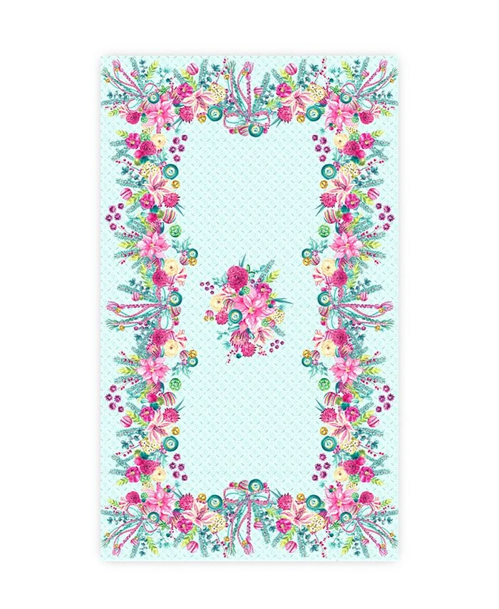 Out with the old, in with the new this holiday design “Boho Christmas” tablecloth, features a watercolor floral arrangement in magenta, pink, red, and green hues. The centerpiece of poinsettias, ornaments, and holiday greenery is the perfect addition to the tone-on-tone mint trellis background.