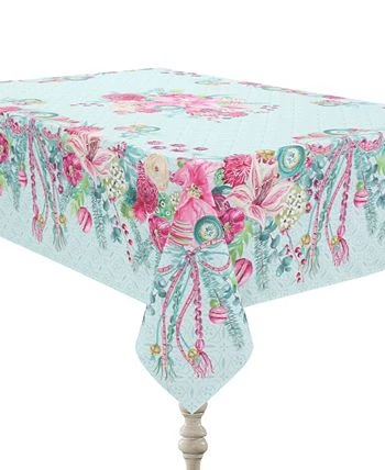 Out with the old, in with the new. This holiday design “Boho Christmas” tablecloth, features a watercolor floral arrangement in magenta, pink, red, and green hues. The centerpiece of poinsettias, ornaments, and holiday greenery is the perfect addition to the tone-on-tone mint trellis background.