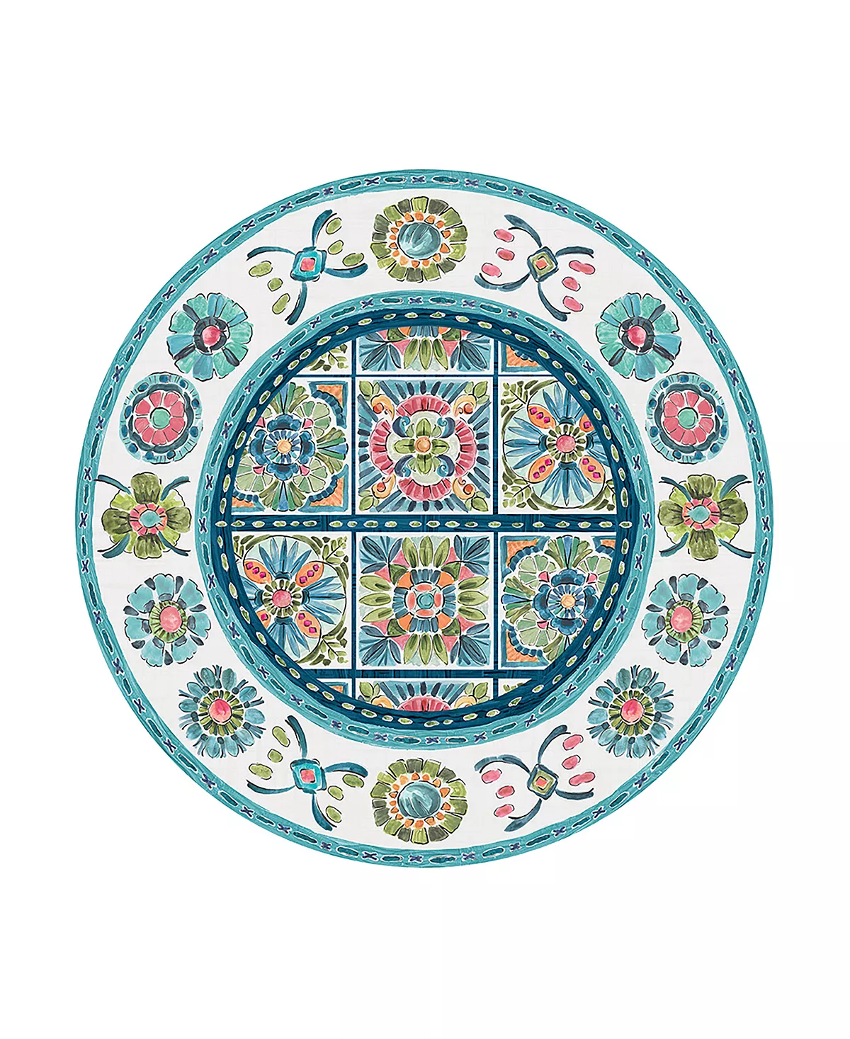 This boho themed tablecloth, “Boho Plaza” tablecloth will give any home a fun pop of color. “Boho Plaza” features vibrant pink, green, and blue tile patterns on the top and border of the design. Add this bold, soft to the touch tablecloth will illuminate any dining space for any occasion.