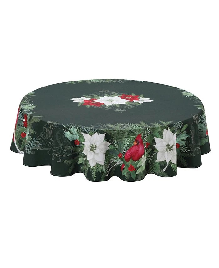 To many, the holidays are the most wonderful time of year. The “Christmas Elegance” round tablecloth features bold cardinals surrounded by bright white and red poinsettias. Details of greenery and branches make the perfect nest on a dark green background.