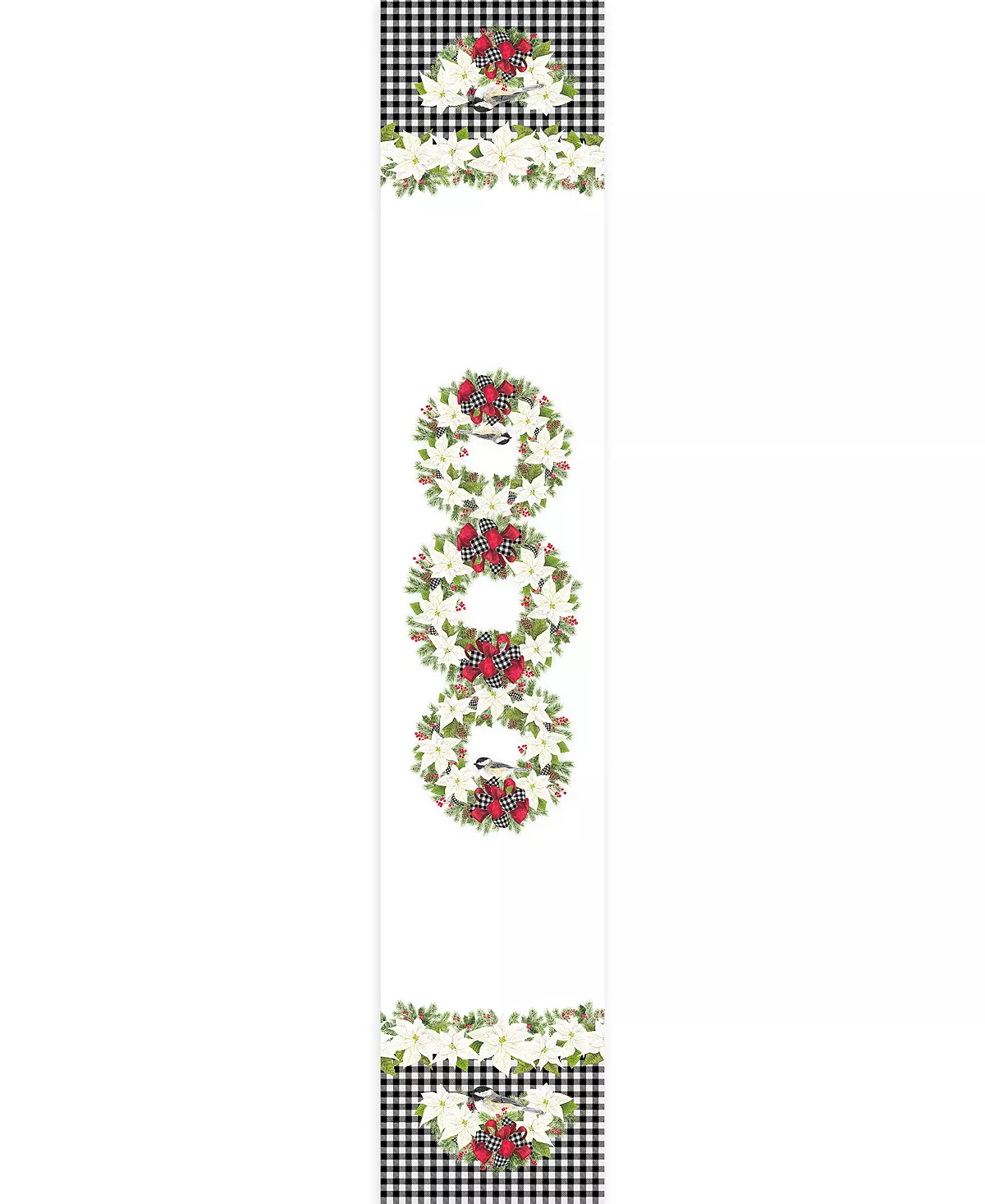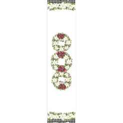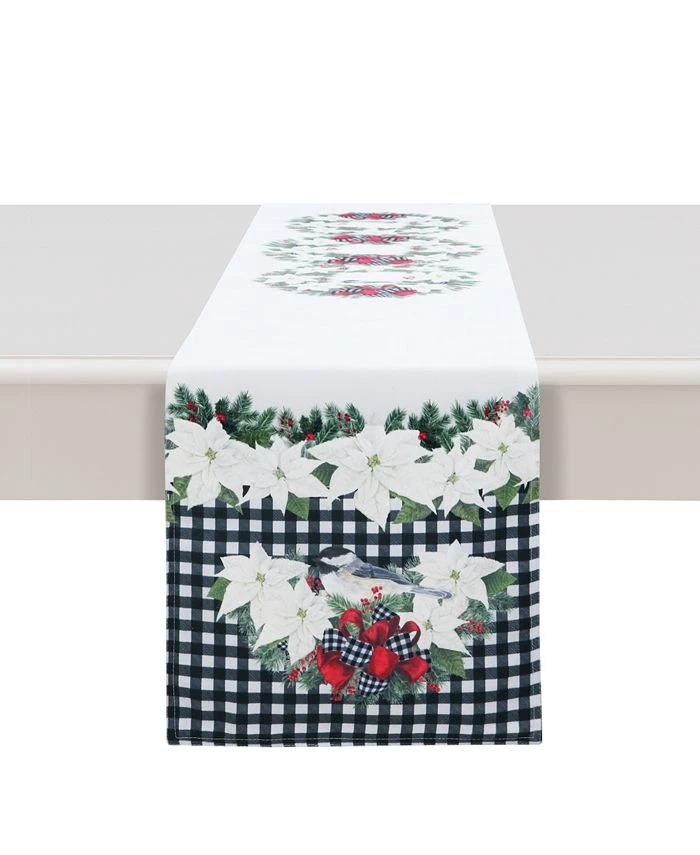 Christmas Trimmings table runner is the perfect compliment to all your holiday decorations. Bringing holiday cheer with white poinsettias, beautiful bows, green garlands cute chickadees this elegant runner creates the perfect accent to your holiday table