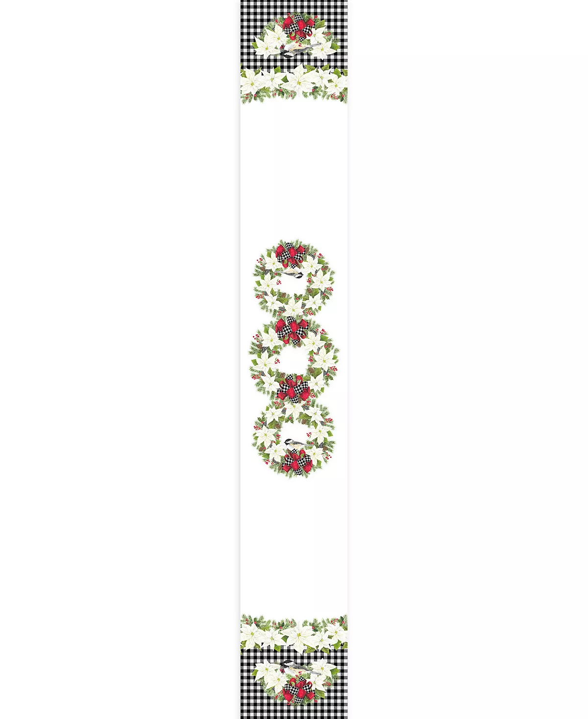 Christmas Trimmings table runner is the perfect compliment to all your holiday decorations. Bringing holiday cheer with white poinsettias, beautiful bows, green garlands cute chickadees this elegant runner creates the perfect accent to your holiday table