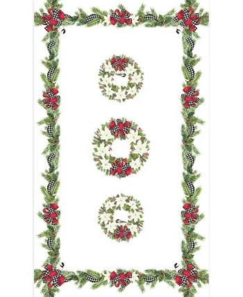Christmas Trimmings tablecloth is the perfect compliment to all your holiday decorations. Bringing holiday cheer with white poinsettias, beautiful bows, green garlands cute chickadees this elegant runner creates the perfect accent to your holiday table