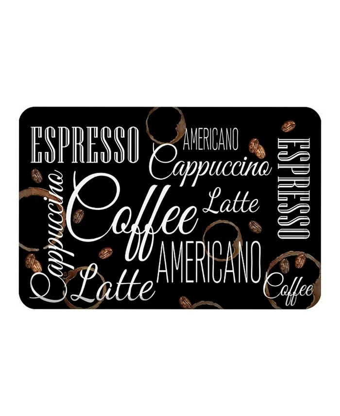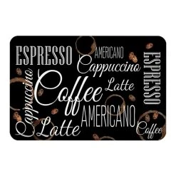 This coffee themed accent floor mat, Coffee Shop brings a cafe essence to any home. Different types of coffee expressions are scattered around the design with coffee beans and marks against a black background. Coffee Shop will definitely create a fun look in every home.