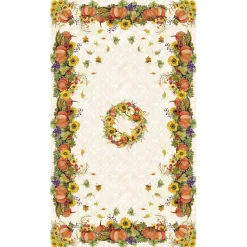 This seasonal “Cornucopia Harvest” design comes to life to form the perfect fall tablecloth. This tablecloth features a cornucopia filled with pumpkins, gourds, and corn. In the center is a sunflower wreath. The autumnal colors of yellow, orange, and green shine on the diamond trellis background.