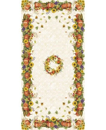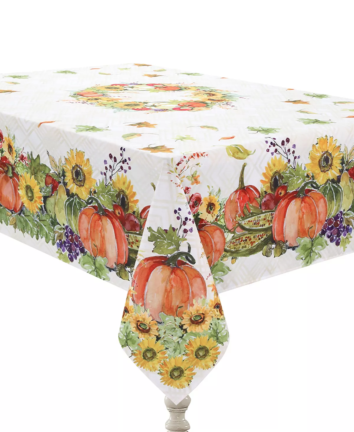 This seasonal “Cornucopia Harvest” design comes to life to form the perfect fall tablecloth. This tablecloth features a cornucopia filled with pumpkins, gourds, and corn. In the center is a sunflower wreath. The autumnal colors of yellow, orange, and green shine on the diamond trellis background.