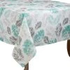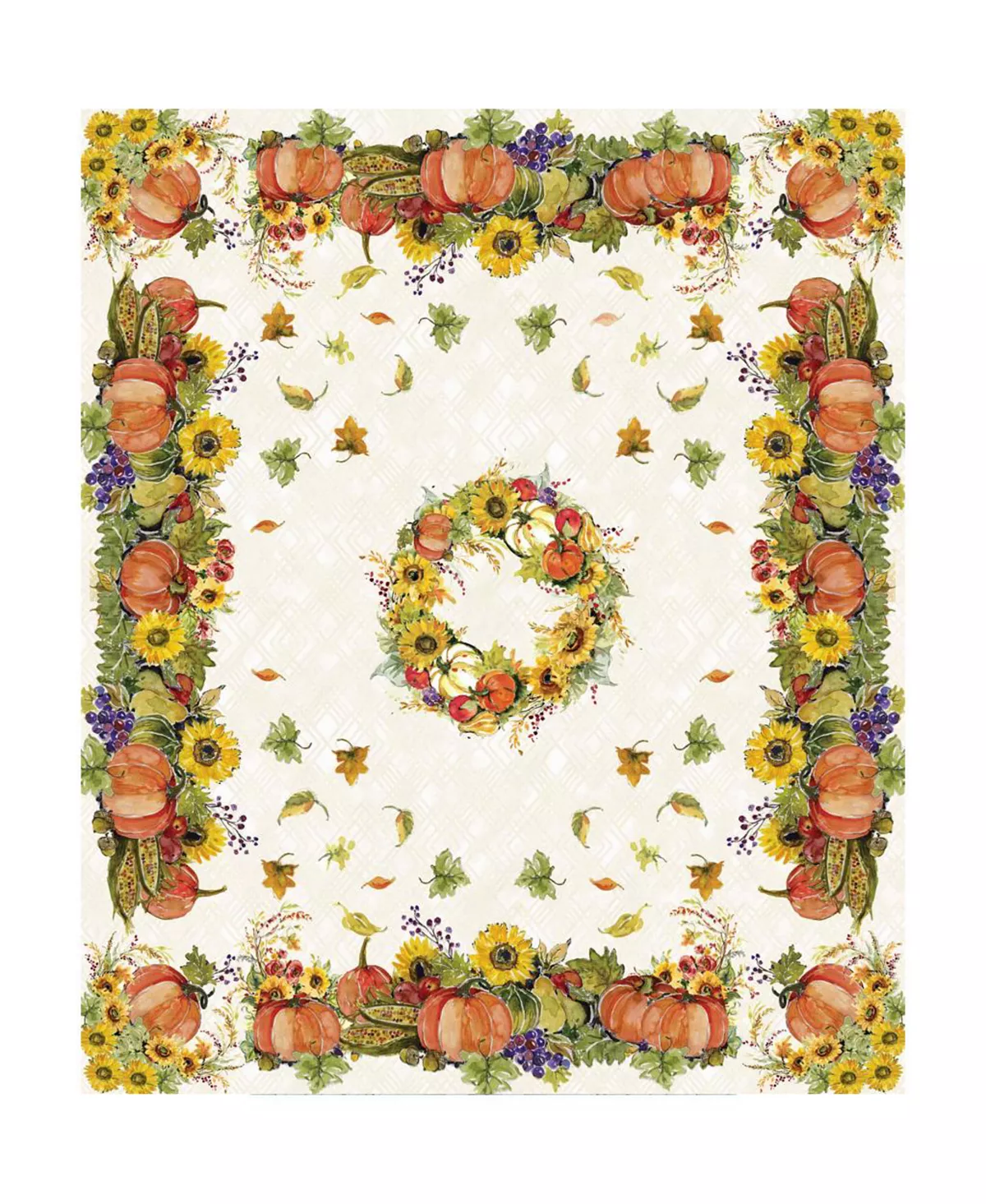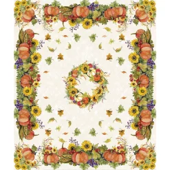 This seasonal “Cornucopia Harvest” design comes to life to form the perfect fall tablecloth. This tablecloth features a cornucopia filled with pumpkins, gourds, and corn. In the center is a sunflower wreath. The autumnal colors of yellow, orange, and green shine on the diamond trellis background.