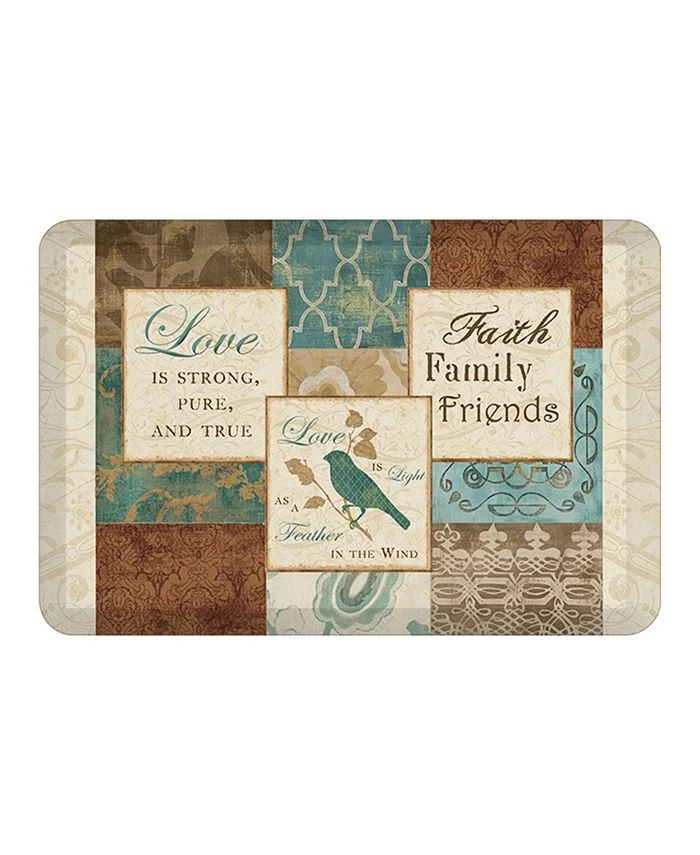 The patterned accent floor mat, Faith, Family, Friends, is a classic look that will fit in any home. The inspirational design features phrases in three ivory squares against blue, brown, beige patterned tiled background. Bring home Faith, Family, Friends accent floor mat to spice up your home.