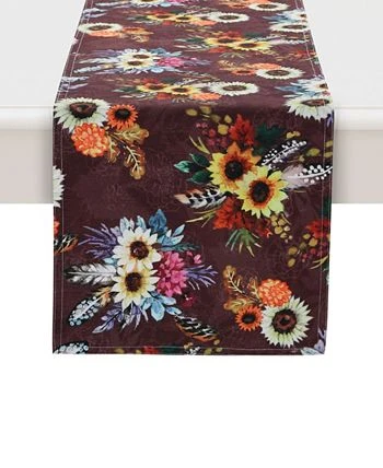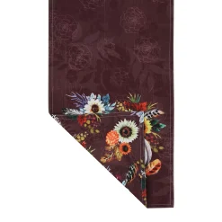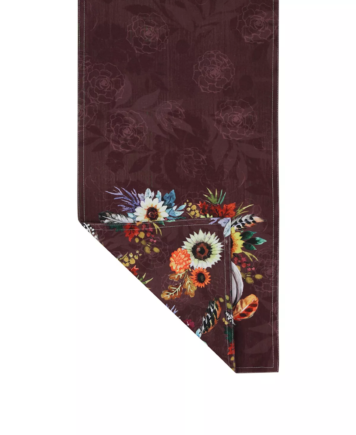 “Fall Feathers” reversible runner features jewel-toned watercolor flowers, sunflowers, pumpkins, and fun feathers. In the center are three elegant wreaths. The background contrasts the bright colors with a rich maroon-colored decorative pattern of line art flowers and floral silhouettes.