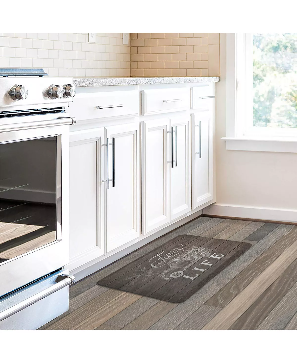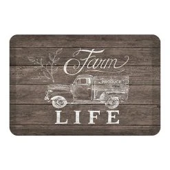 This farmhouse inspired accent floor mat, Farm Life will create a rustic look in any home. The design features a a truck and plant painted in a distressed white texture against brown wooden planks. Add this unique mat to your room for a subtle barn vibe.