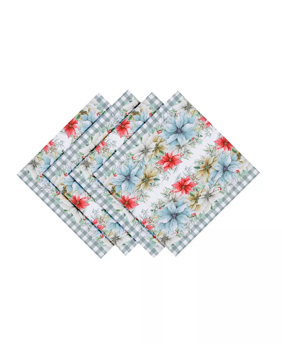 “Glad Tidings” is a chic and modern holiday napkin design. Dusty blue, mushroom, ruby red, and golden mustard watercolor poinsettias, placed on holly and a green-gray gingham pattern, create the epitome of a new take on a classic Christmas.