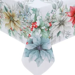 “Glad Tidings” is a chic and modern holiday round tablecloth. In the center, a long swag adds a touch of elegance. The design features dusty blue, mushroom, ruby red, and golden mustard poinsettias placed on greenery and holly. This design is the epitome of a new take on a classic Christmas.