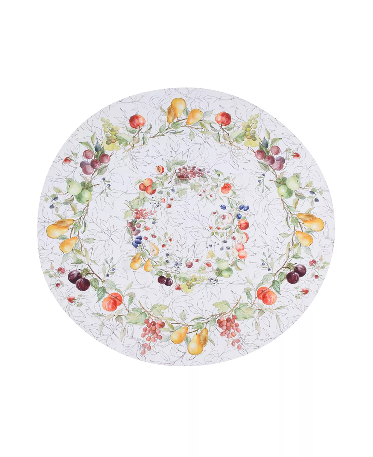 This food-inspired round tablecloth, “In the Orchard,” features an abundance of watercolor fruit. Nestled on the border are soft green leaves with rich colored fruit, apples, peaches, plums, to name a few. The center features a wreath with line drawings of leaves on an off-white background.