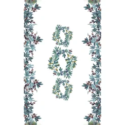 This landscape inspired tablecloth, “Olive Grove,” features beautiful detailed olive branches throughout the border. The design surrounds a hand painted countryside villa with natural hues of greens, purples, browns. Add this soft runner for a unique rustic focal point to your dining space.