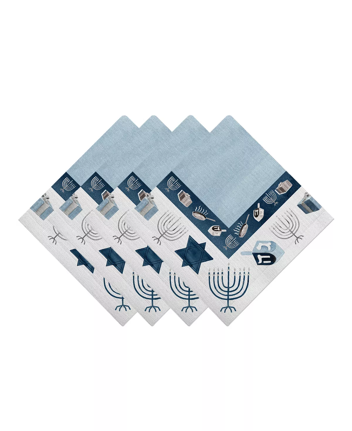 This napkin set, “Happy Hanukkah”, features various Hanukkah motifs such as dreidels, menorahs, and Star of David on a white and light blue background. Whether youβre planning to invite your extended family or just a small circle, this lighthearted design will rise to the occasion.