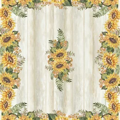 This floral tablecloth, “Sunflower Day,” is a perfect way to create a fun rustic table setting. The design features hand painted sunflowers in warm yellow, brown, green hues with pink accent flowers against a wooden background. Add this beautiful, soft to the touch tablecloth to any dining area.