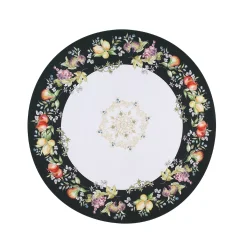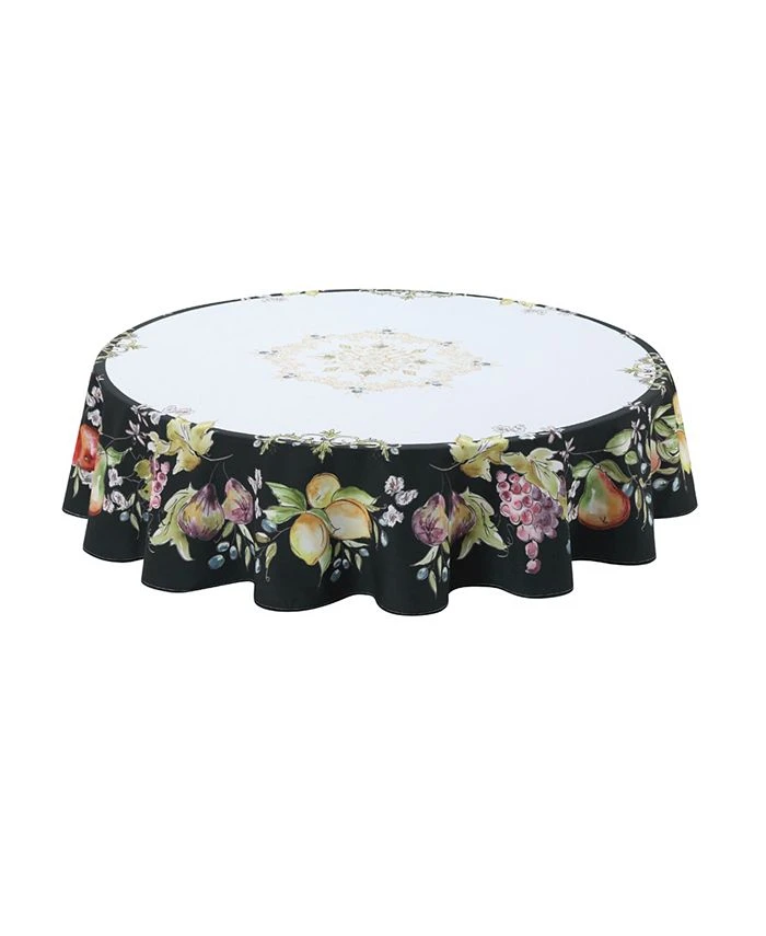 This food-inspired round tablecloth “Tuscan Fruit Sketch” features watercolor fruit, pomegranates, lemons, figs, pears, grapes, and a contrasting black background. In addition, the clean white center dazzles with a golden medallion as the focal point.