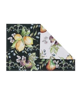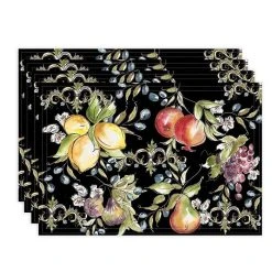 This food-inspired reversible placemat “Tuscan Fruit Sketch” features watercolor fruit, pomegranates, lemons, figs, pears, and grapes. The contrasting black background plays off the rich colors of the fruit. This placemat will add a special touch of elegance to your everyday table.